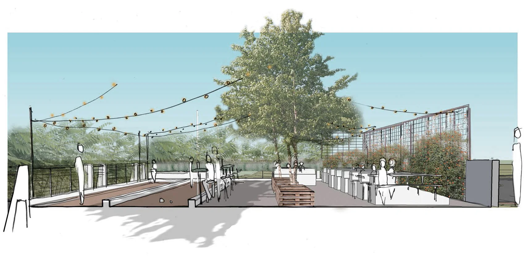 Realized bocce court and custom tables and lighting, all of which I devised and drew detailed drawings for with the guidance of Mary Wolf and Paul Josey
